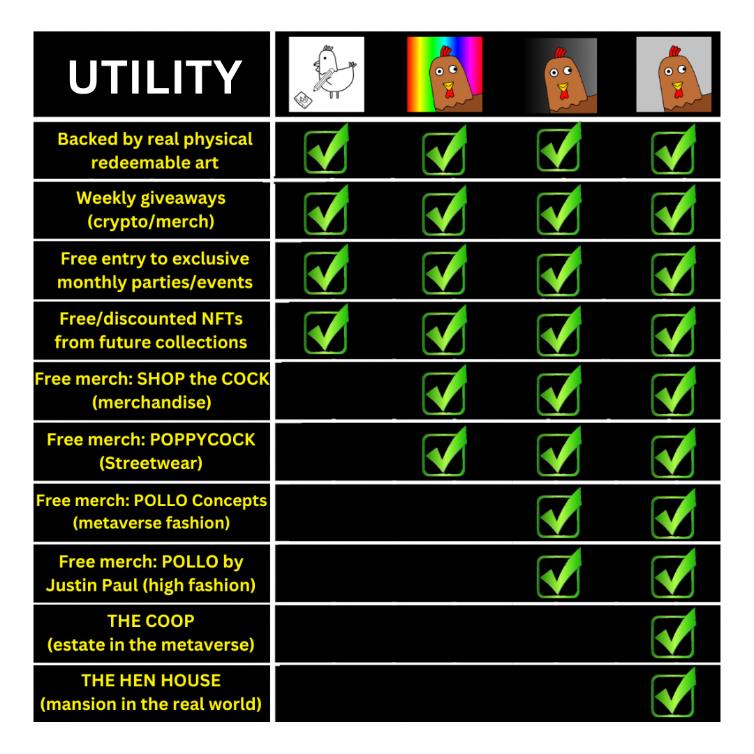 Whoever holds the "Cock" NFT will get the master bedroom of The Hen House mansion. The "Cock" NFT is the most special one because it is the original Poppycock.